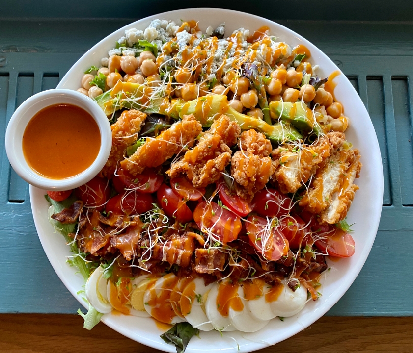 Arcadian Greens, Tomato, Bacon, Blue Cheese Crumbles, Eggs, Avocado, Red Onions, DEN dressing