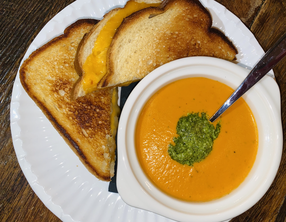 Provolone, American & Cheddar Cheese, Thick White Bread, House Made Tomato Bisque, Topped with Basil Pesto