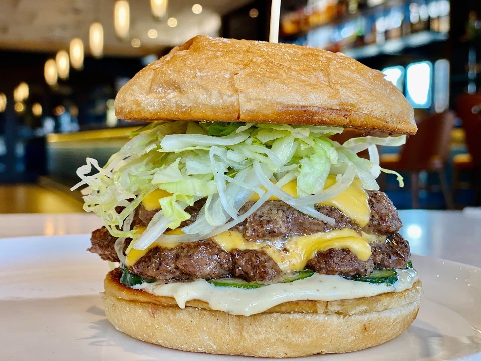 Two Beef Patties, American Cheese, Lettuce, Bacon, Tomato Onion Jam, Tobacco Onions, Pickle Chips, Brioche Bun